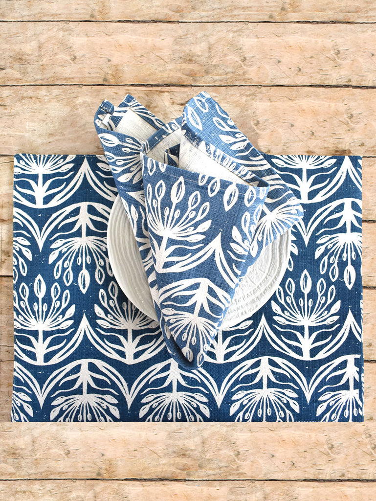Bring artistry and tranquility to your dining table with French Home’s Botanical indigo placemats, designed by Carole Nevin. Handcrafted from 100% cotton twill, this set of four placemats features a crisp white floral motif that stands out beautifully against a deep indigo background, creating a look is timeless and serene. Each placemat is printed and crafted by hand resulting in subtle variations. Perfect for gifting or adding a refined touch to your table.