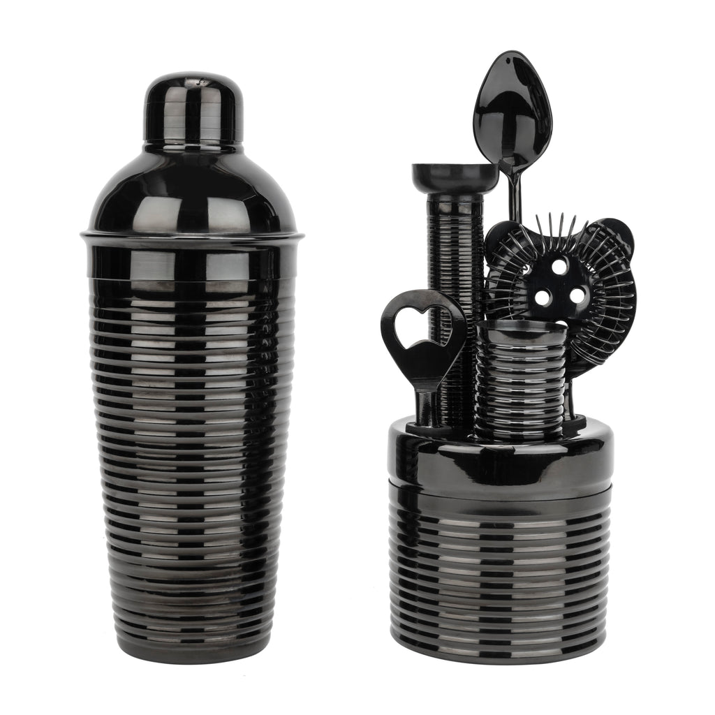 | Inspired by the elegance and warmth of a luxurious bar, French Home’s chic, textured, polished black metal barware set brings style and sophistication to your cocktail crafting. Whether mixing up a spicy margarita, an espresso martini, or a classic old fashioned, this durable, corrosion-resistant 7-piece set has everything you need, including a shaker, strainer, bottle opener, muddler, jigger, bar spoon, and a convenient holder. Crafted for home bartenders and cocktail enthusiasts alike, this refined set is perfect for making your favorite cocktails or experimenting with new creations. |