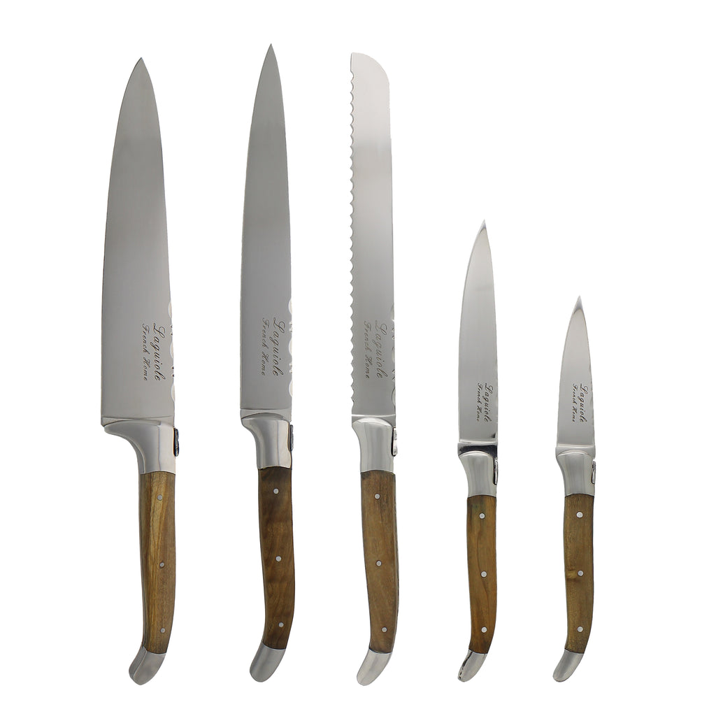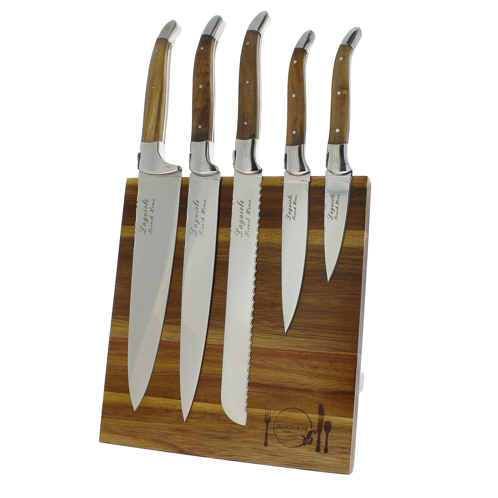 | Whether carving a roast, chopping vegetables or slicing a loaf of fresh bread the French Home kitchen knife set is perfect for all your food preparation needs. Five piece set includes a chef's knife, carving knife, bread knife, utility knife and paring knife. Olive wood handles and traditional French design add an elegance to your kitchen and inspiration to your cooking. Attractive magnetic wood display for the knives makes them visible and easily accessible. The bee emblem on the knife signifies the Laguiole design. Laguiole is a town in the Aveyron region of southern France where this style originated in the 1820's. |