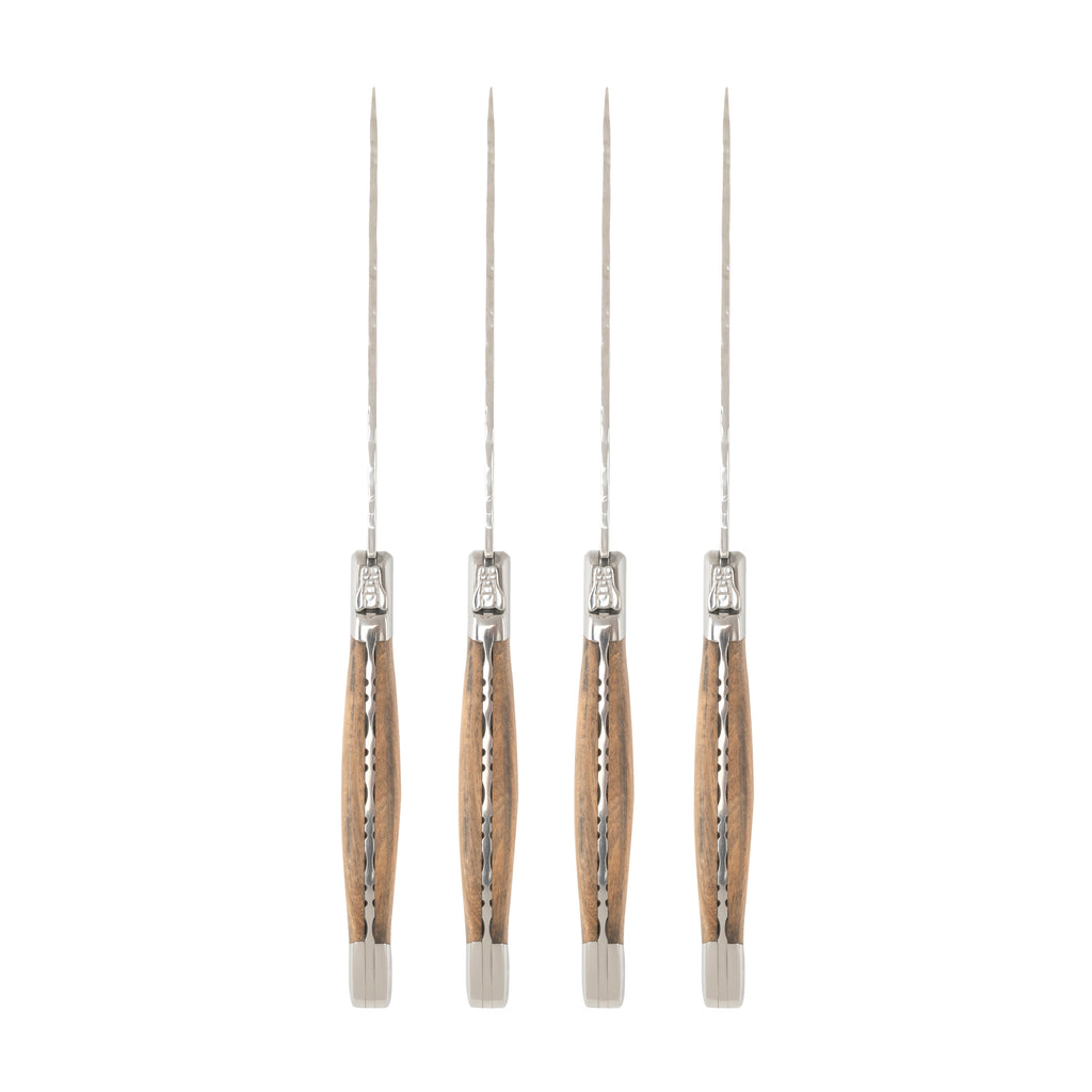 | French Home's traditional 10" grande connoisseur Laguiole steak knives have the iconic three rivet curved handle and artfully hammered stainless steel cutting blades. The knives are perfectly weighted with 2.5mm fully tanged blades, handsome olive wood handles that fit comfortably in your hand and a bolster decorated with the iconic French Laguiole Bee. These elegant 10" knives in the connoisseur collection are larger, more substantial and more comfortable to use than other Laguiole knives on the market which is why they are used in some of the best steak houses in France. The 4 piece set comes in an attractive box making it the perfect gift for the steak and BBQ lover. Laguiole is a town in southern France where this style of knife was designed in the 1820s. |