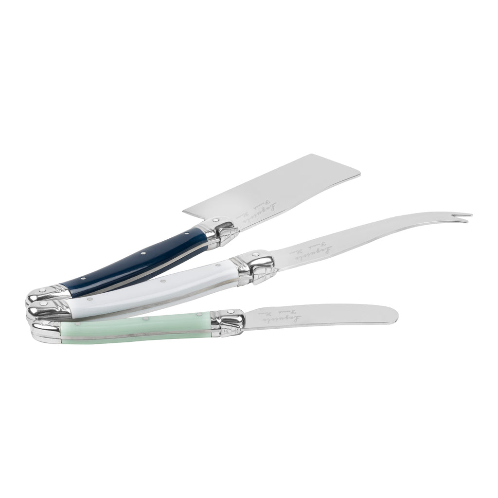| It’s 5 o’clock somewhere and it’s time for cheese and crackers. Breakout the creamy Brie, sharp cheddar, and delicious Boursin with French Home’s 3-piece Laguiole cheese knife set, with serene coastal inspired sea salt-colored handles. This set includes a cheese cleaver, pronged cheese knife, and a spreader, perfect for serving a variety of cheeses. These knives are dishwasher safe making them as practical as they are elegant. The Laguiole design originated in France in the 1820s and is renowned for its three-rivet curved handle with bee emblem on the bolster symbolizing Napoleon and the French monarchy. |