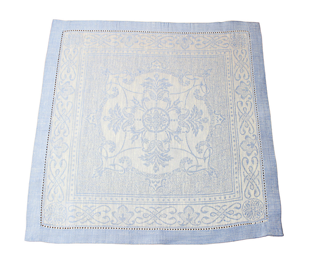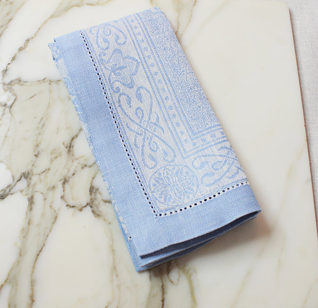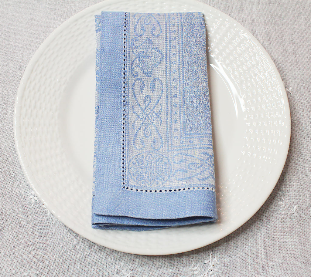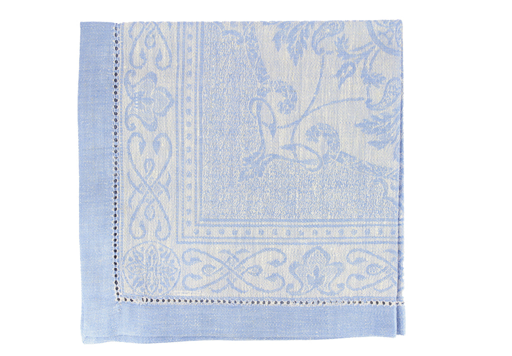 | Enhance your dining room décor with French Home’s luxurious 18’’ x 18’’ Astra 100% woven linen napkins made in Portugal. The clean and graceful lines of the Astra napkin give way to an enchanting renaissance fairytale design in dreamy and romantic shades of ivory and pale blue that are showcased spectacularly by the woven jacquard fabric and is the ideal finishing touch to a beautiful table setting. When taken care of properly, these high-quality linen napkins can provide a lifetime of use. Steaming or ironing is required for peak smoothness and crispness after cleaning, in your washing machine or professionally.