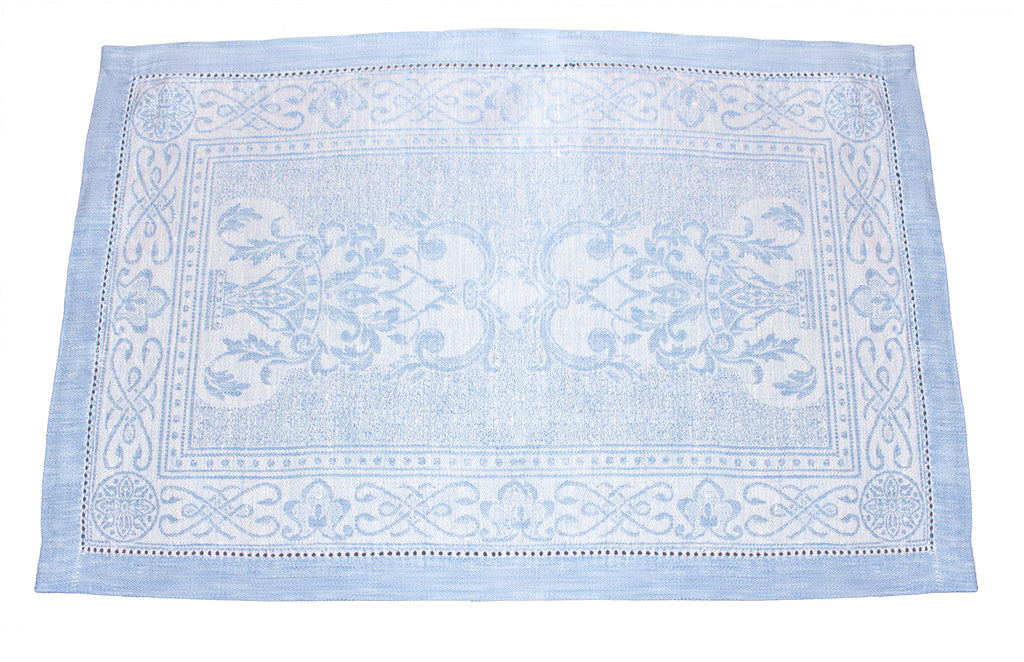 | Enhance your dining room décor with French Home’s luxurious 14’’ x 21’’ Astra 100% woven linen placemats made in Portugal. The clean and graceful lines of the Astra placemat give way to an enchanting renaissance fairytale design in dreamy and romantic shades of ivory and pale blue that are showcased spectacularly by the woven jacquard fabric and is the ideal finishing touch to a beautiful table setting. When taken care of properly, these high-quality linen placemats can provide a lifetime of use. Steaming or ironing is required for peak smoothness and crispness after cleaning, in your washing machine or professionally.