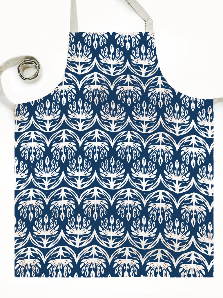 Bring artistry and tranquility to your kitchen with French Home’s Botanical indigo apron, designed by Carole Nevin. Handcrafted from 100% cotton twill, it features a crisp white botanical motif that contrasts beautifully against a deep indigo background, creating a look that feels timeless and serene. Blending style with practicality, this apron includes handy pockets, an adjustable neck strap, and long waist ties to ensure a comfortable fit. Each apron is printed and crafted by hand resulting in subtle variations. Perfect for gifting or adding a refined touch to your kitchen.