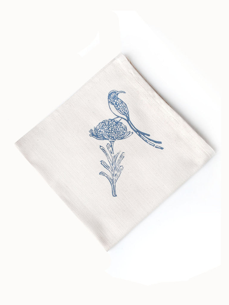 Bring artistry and tranquility to your table with French Home’s Sugarbird napkins, designed by Carole Nevin. Handcrafted from 100% cotton twill, this set of four napkins features the enchanting Cape sugarbird delicately perched on South Africa’s bold and beautiful pincushion flower in a serene indigo color. Each napkin is carefully handprinted and crafted by skilled artisans resulting in subtle variations. Perfect for gifting or adding a refined touch to your table.