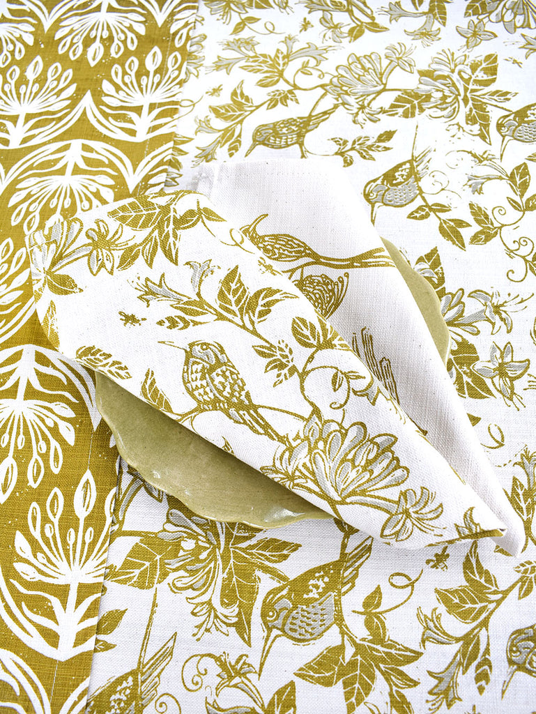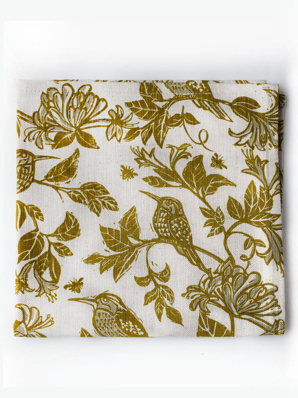 Bring artistry and tranquility into your kitchen with French Home’s Honeysuckle chartreuse napkins, designed by Carole Nevin. Handcrafted from 100% cotton twill, this set of four napkins features a lively natural botanical print of blooming honeysuckle intertwined with enchanting Cape sugarbirds. The fresh chartreuse palette and structured floral design create a look that is timeless and serene. Each napkin is handprinted and crafted by skilled artisans resulting in subtle variations. Perfect for gifting or adding a refined touch to your table.