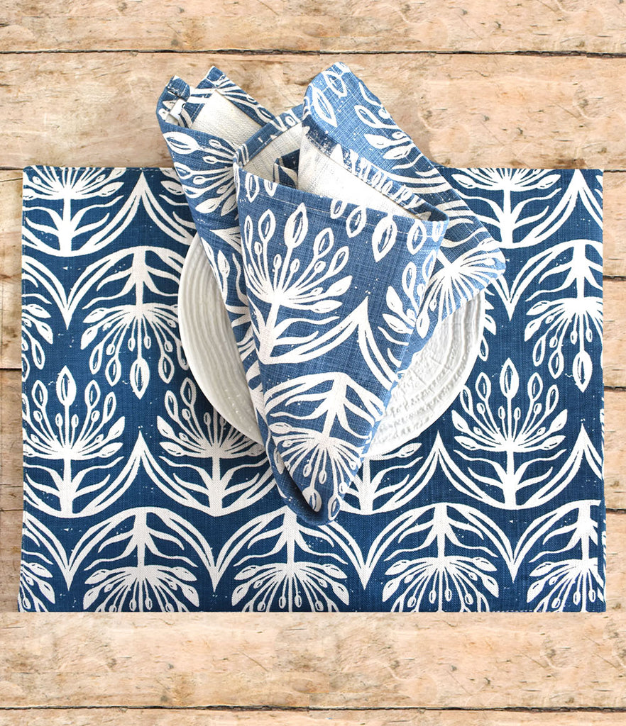 Bring artistry and tranquility to your dining table with French Home’s Botanical indigo placemats, designed by Carole Nevin. Handcrafted from 100% cotton twill, this set of four placemats features a crisp white floral motif that stands out beautifully against a deep indigo background, creating a look is timeless and serene. Each placemat is printed and crafted by hand resulting in subtle variations. Perfect for gifting or adding a refined touch to your table.