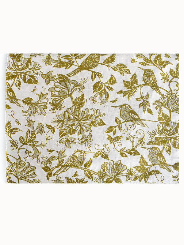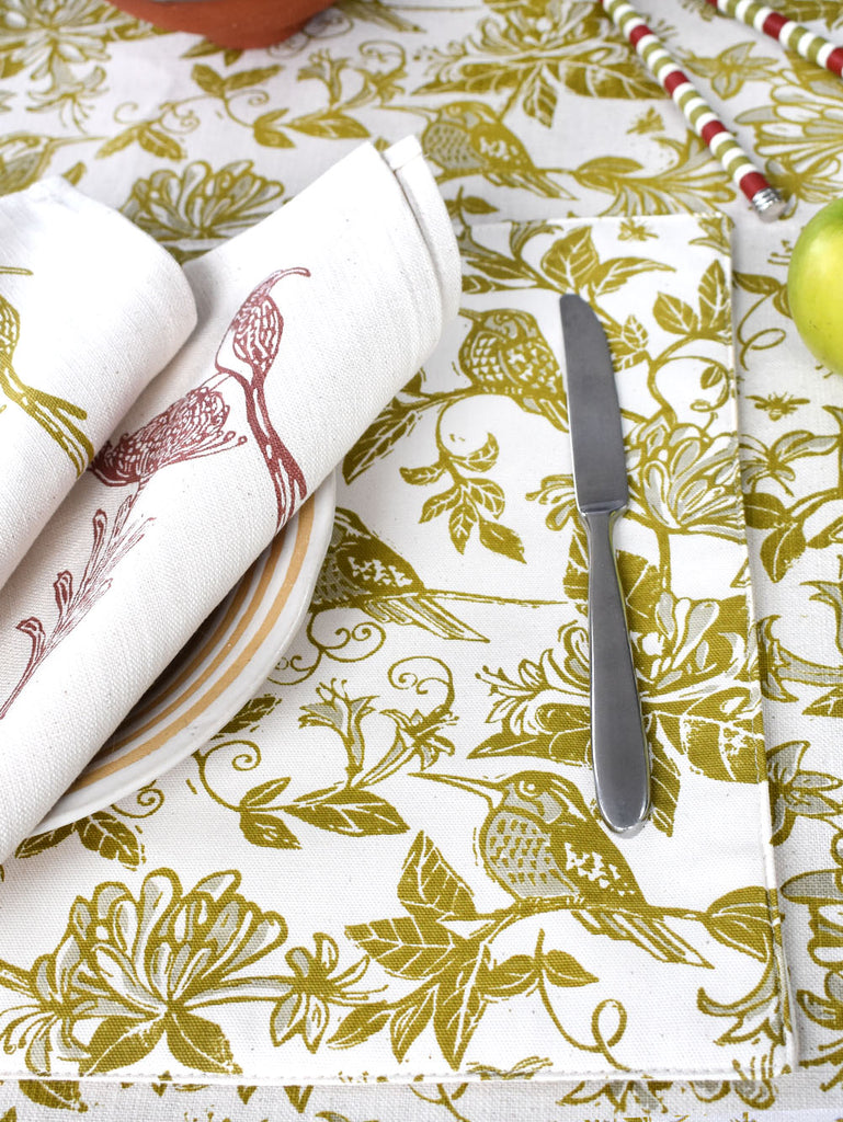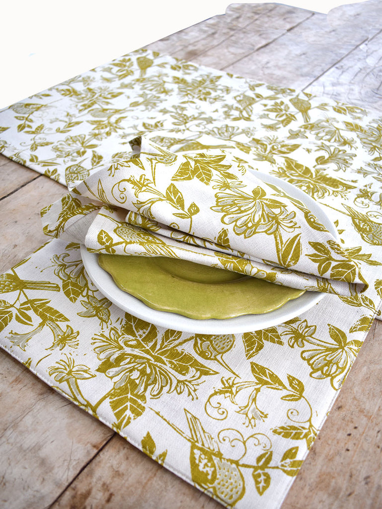 Bring artistry and tranquility into your kitchen with French Home’s Honeysuckle chartreuse placemats, designed by Carole Nevin. Handcrafted from 100% cotton twill, this set of four placemats features a lively natural botanical print of blooming honeysuckle intertwined with enchanting Cape sugarbirds. The fresh chartreuse palette and structured floral design create a look that is timeless and serene. Each placemat is handprinted and crafted by skilled artisans resulting in subtle variations. Perfect for gifting or adding a refined touch to your table.