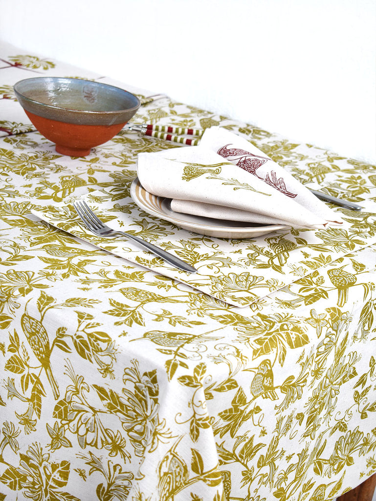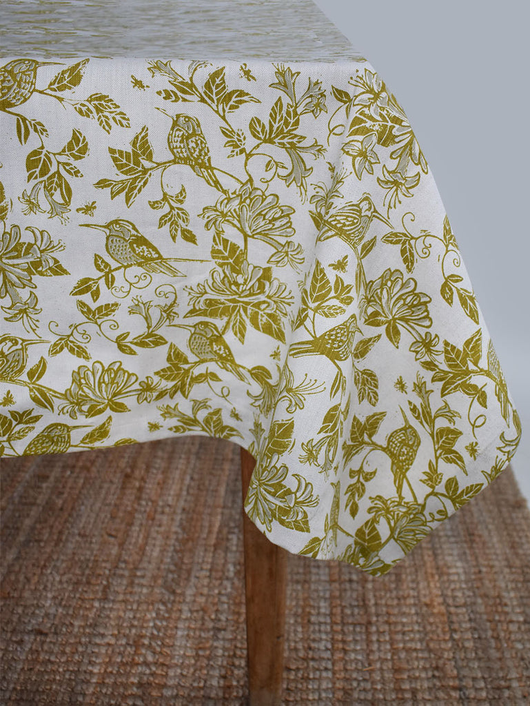 Bring artistry and tranquility into your kitchen with French Home’s Honeysuckle chartreuse tablecloth, designed by Carole Nevin. Handcrafted from 100% cotton twill, this tablecloth features a lively natural botanical print of blooming honeysuckle intertwined with enchanting Cape sugarbirds. The fresh chartreuse palette and structured floral design create a look that is timeless and serene. Each tablecloth is handprinted and crafted by skilled artisans resulting in subtle variations. Perfect for gifting or adding a refined touch to your table.