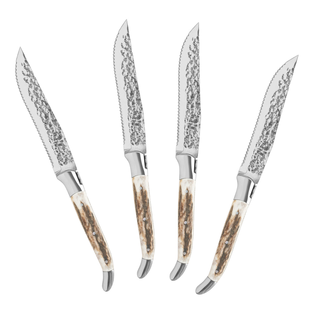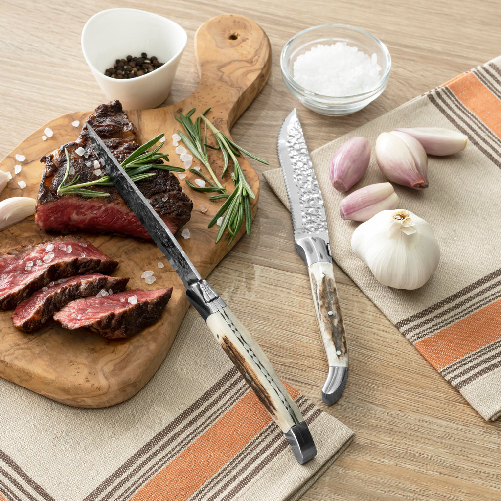 | At the end of the day, enjoy your favorite steak and a stiff drink at the upscale hunting lodge or club serving the best tomahawk steak in town. While using French Home’s Laguiole BBQ steak knives with deer horn handles, you notice they have a texture that make them easy to grip and comfortable to hold. The natural materials are durable and the 2.5mm thick stainless-steel blades are fully tanged, meaning the sturdy blade extends through to the end of the handle. The traditional Laguiole design of the knife features a three-rivet curved handle with etched detailing on the spine and a bee emblem on its bolster, one of Napoleon and the French monarchy’s symbols. Enjoy a perfectly seared and seasoned steak is enhanced by well-made and elevated cutlery. French Home’s rugged BBQ Laguiole steak knives come in a very handsome wood box ideal for storage and gift giving. |