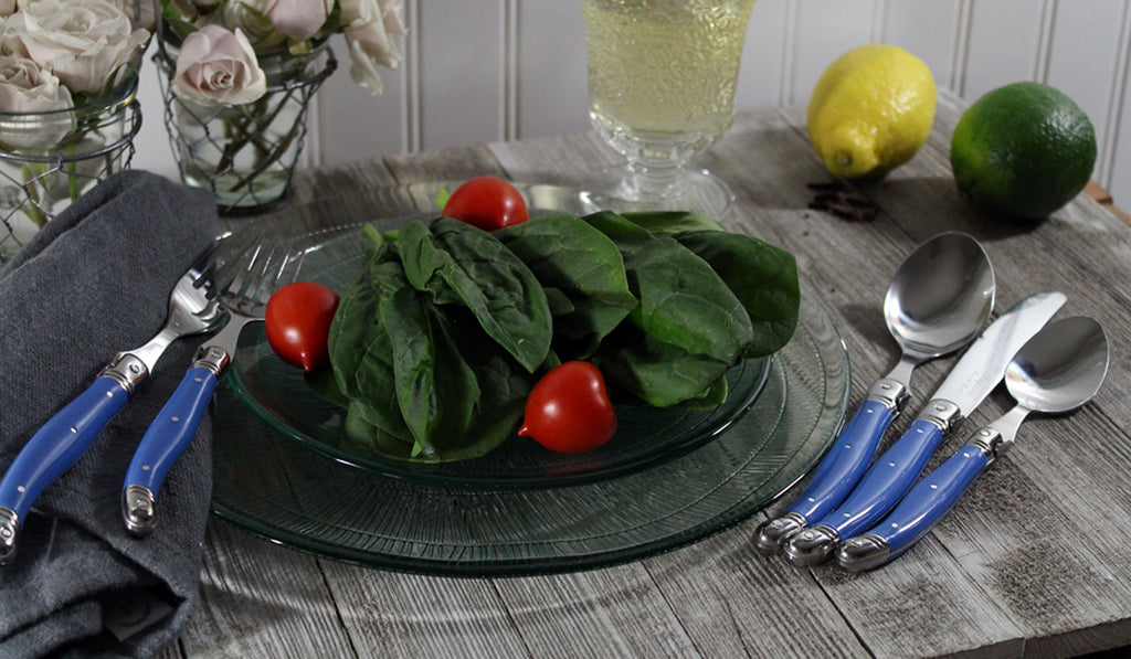 French Home's traditional and elegant Laguiole design with the iconic three Rivet curved handle and Bee emblem is comfortable to hold and perfectly balanced. Ideal for casual or formal dining, the fully tanged 20 piece stainless steel set has French Blue handles and is dishwasher safe. Laguiole is a town in France where this style of cutlery originated. Set includes four 9.25" dinner knives, four8.5" dinner forks, four 8.25" soup spoons, four 7.25" salad forks and four 7.25" dessert spoons.