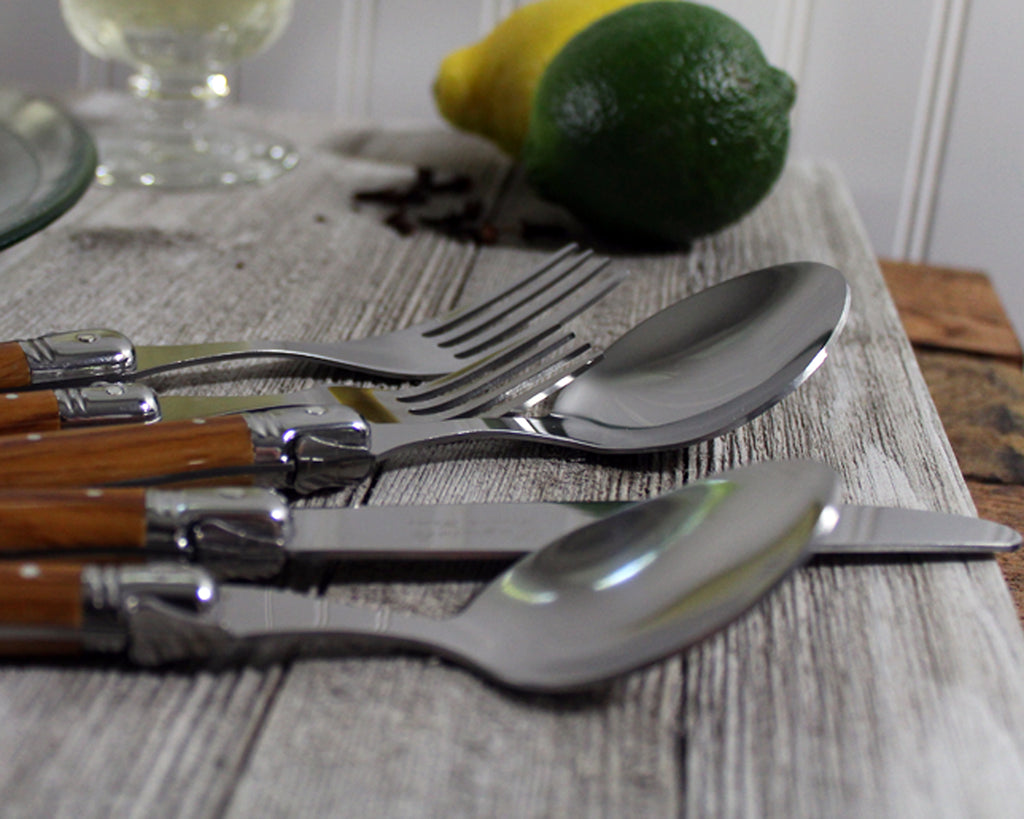 French Home's traditional and elegant Laguiole design with the iconic three Rivet curved handle and Bee emblem is comfortable to hold and perfectly balanced. Ideal for casual or formal dining, the fully tanged 20 piece stainless steel set has faux wood handles and is dishwasher safe. Laguiole is a town in France where this style of cutlery originated. Set includes four 9.25" dinner knives, four 8.5" dinner forks, four 8.25" soup spoons, four 7.25" salad forks and four 7.25" dessert spoons.