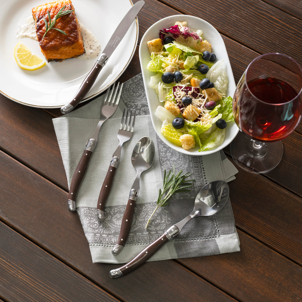 | Dine indoors or al fresco with French Home’s casually luxurious 20-piece Laguiole flatware set, featuring handles in a refined and timeless shade of chocolate brown. Ideal for everyday or special occasion use, the neutral and earthy-colored ABS handles of this elegantly relaxed Laguiole flatware elevate any table setting. The Laguiole design originated in France and is renowned for having a three-rivet curved handle with the iconic bee emblem on its bolster. The bee is a symbol of Napoleon and the French monarchy. Made with 1.8mm stainless-steel, these ergonomically designed utensils are comfortable to hold and dishwasher safe. This set includes service for four, perfect for intimate gatherings or family meals. Add a touch of French chicness to your dining occasions with this stunning flatware collection. |