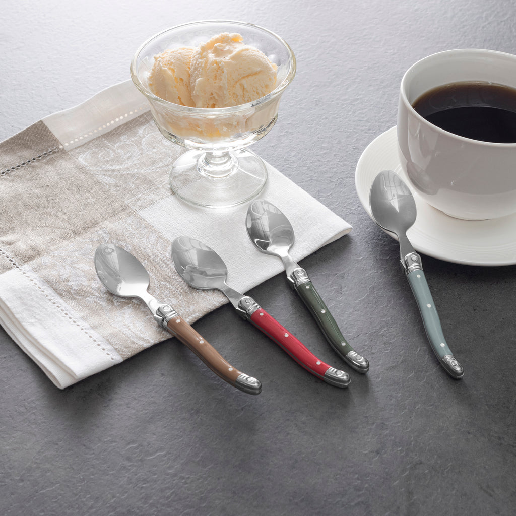 French Home’s beautiful set of Laguiole coffee and dessert spoons, with handles in cranberry reds, evergreens, and a touch of gold, are perfect for enjoying delicious ice cream, fruit salad, or a cup of hot chocolate, tea, or coffee. Essential for entertaining, these perfectly sized 6” Laguiole spoons are dishwasher safe making them as practical as they are elegant. The Laguiole design originated in France and is renowned for its three-rivet curved handle with a bee emblem on the bolster symbolizing Napoleon and the French monarchy. This set of four coffee spoons comes in a wood tray ideal for storage and gifting.