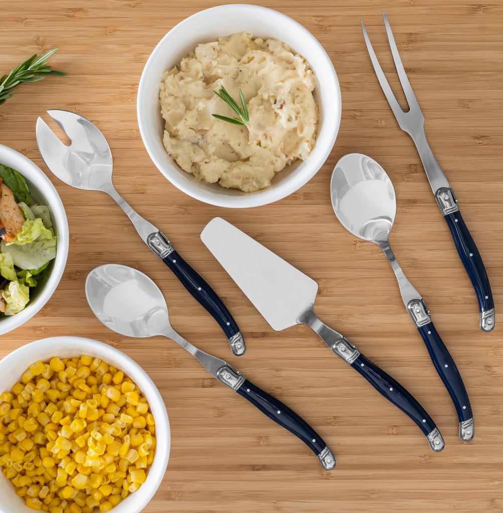 | Serve roasted asparagus wrapped in melted Parmesan cheese, garlicky mashed potatoes, flaky spanakopita, and buttery lemon Chilean sea bass with French Home's 5-piece serving utensil set. This set includes two serving spoons, a slotted serving spoon, a serving fork and a spatula. A must-have for anyone who enjoys entertaining, this set is ideal for serving everything from salads, side dishes, and main courses to desserts. The timelessly chic sophisticated navy blue Laguiole handles are sturdy, comfortable to hold, and dishwasher safe. French Home’s Laguiole utensils have the traditional three-rivet curved handle with iconic bee emblem on its bolster symbolizing Napoleon and the French monarchy. Laguiole is a town in France where this style originated in the 1820s. |