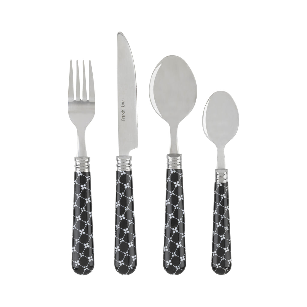 | Enjoy dinning al-fresco on the patio or bring a sense of whimsy and style to each meal with French Home's Bistro Collection. This set is the perfect accompaniment to a more casual table-scape, whether you are enjoying BBQ under the stars, going for a picnic, or having an ice cream party. The casual yet stylish designs of each set makes French Home's Bistro Collection ideal for both indoor and outdoor use. The handles of this casual chic set are made of molded polymer. Each set contains 4 knives, 4 forks, 4 spoons, 4 teaspoons, and 1 convenient caddy for storage and display. All cutlery items are made of stainless steel and are dishwasher safe. |
