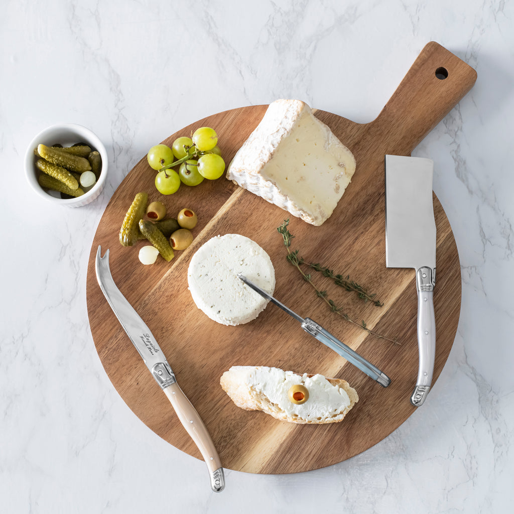 | It’s 5 o’clock somewhere and it’s time for cheese and crackers. Uncork the wine and breakout the creamy Brie, sharp cheddar, and delicious Boursin with French Home’s 3-piece Laguiole cheese knife set with stunning handles in pearlized shades of camel, baby blue, and silvery white. This set includes a cheese cleaver, pronged cheese knife, and a spreader, perfect for serving a variety of cheeses. The knives in this set are dishwasher safe making them as practical as they are elegant. The Laguiole design originated in France and is renowned for having a three-rivet curved handle with a bee emblem on the bolster symbolizing Napoleon and the French monarchy. Laguiole is a town in France where this style originated in the 1820s. |