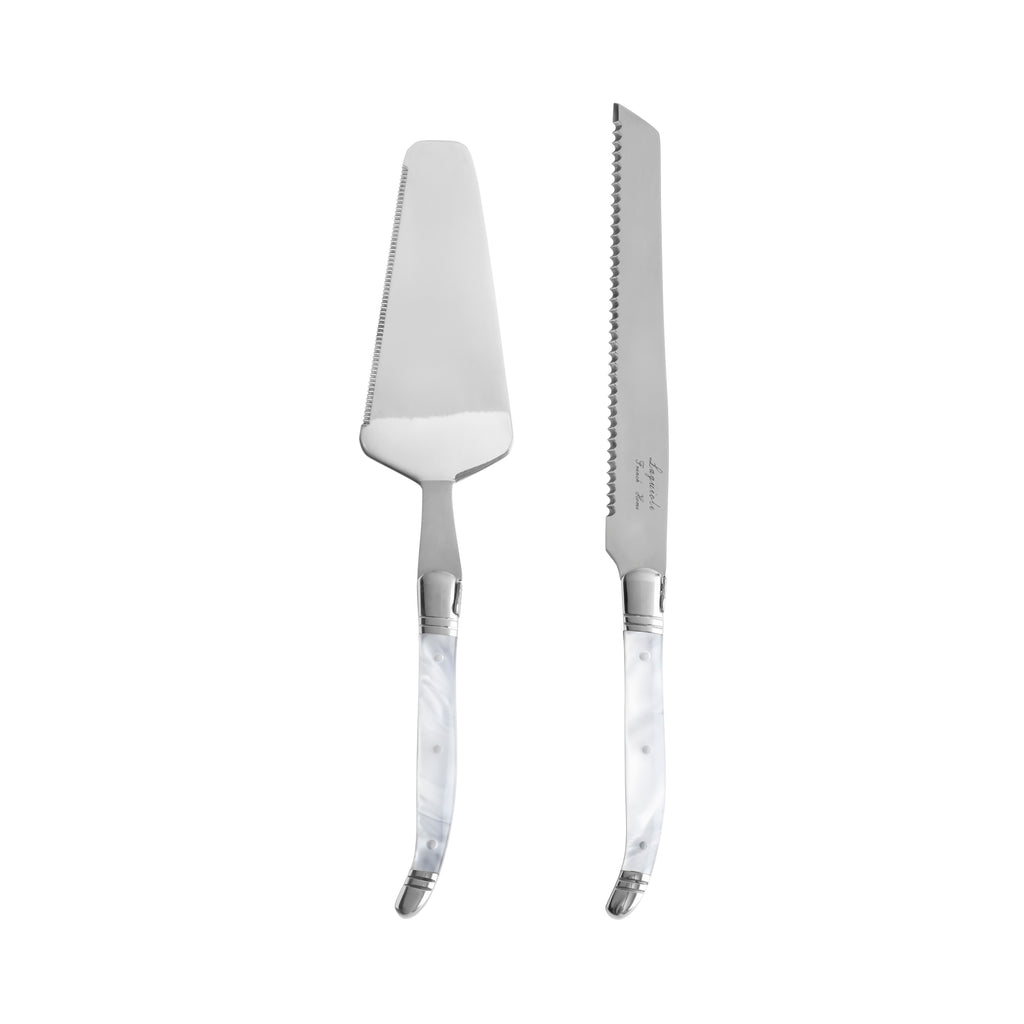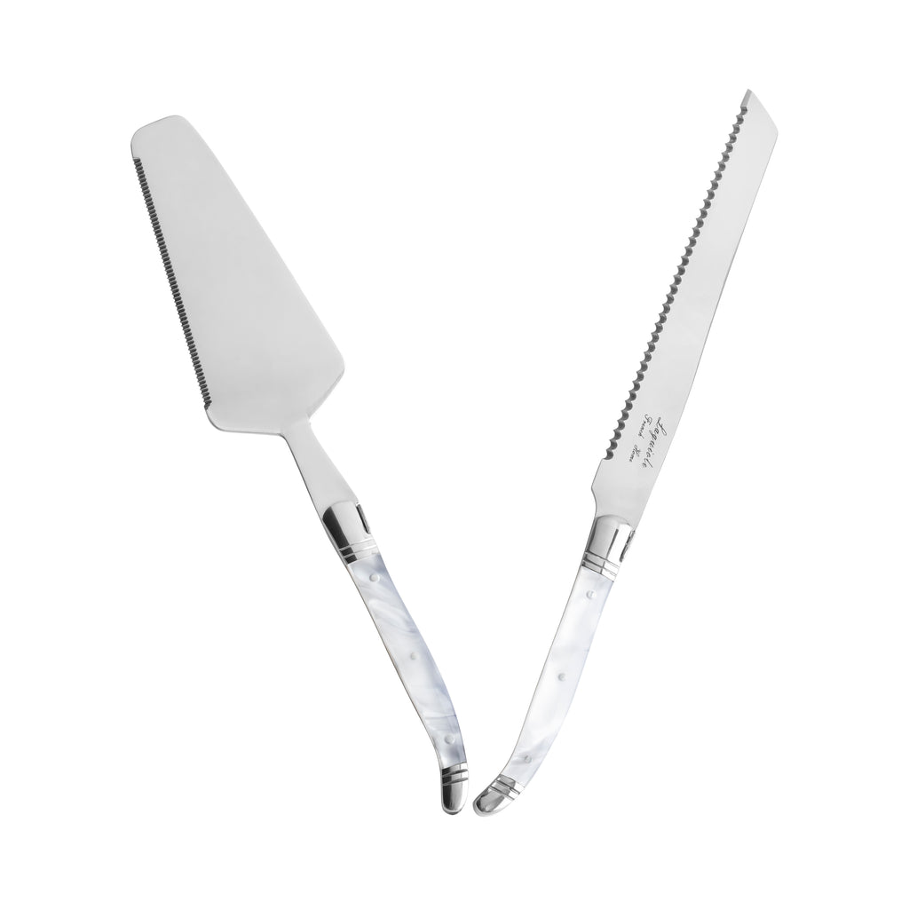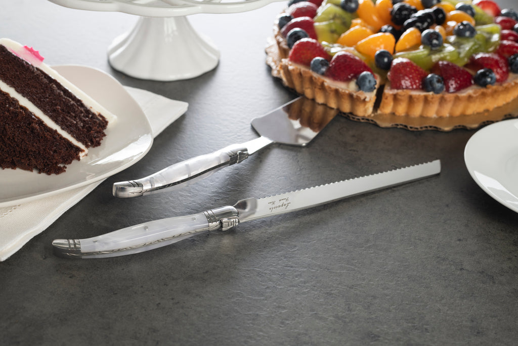 | Celebrate a special occasion or good times with family and friends, making memories using French Home’s stunning 2-piece Laguiole cake knife and pie server set with elegant pearlized white handles. It wouldn’t be Thanksgiving without grandma’s homemade apple pie or a special celebration without a delicious cake and this reliable and beautiful server set will help you easily serve any pie, cake, or tart. The blades on both the 11.5" cake knife and 10.5" server are made from heavy gauge 2.5mm thick stainless-steel that feels solid and substantial. The sophisticated and classically chic pearlized white handles are comfortable to hold and dishwasher safe. The set has a three-rivet curved handle with etched detailing on the spine and a bee emblem on its bolster symbolizing Napoleon and the French monarchy and comes in an attractive box ideal for storage and gift giving. |