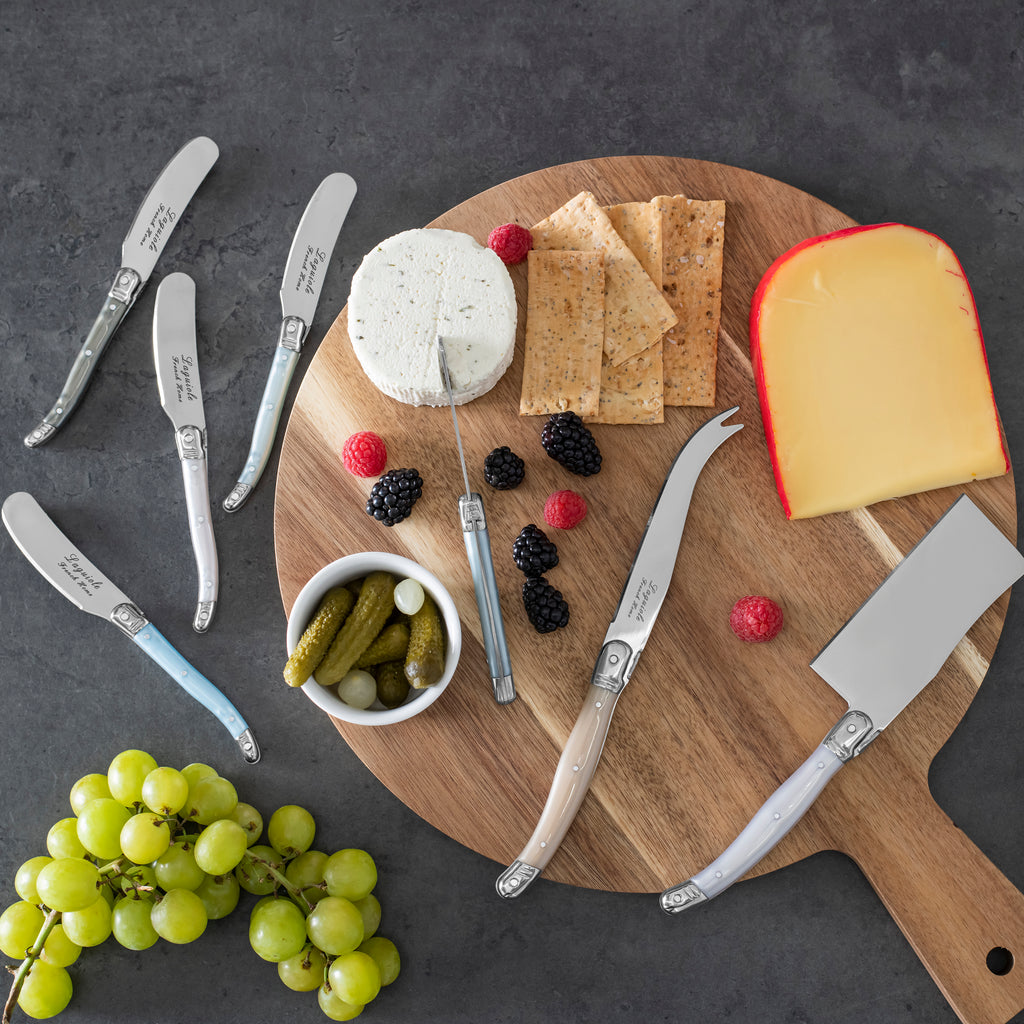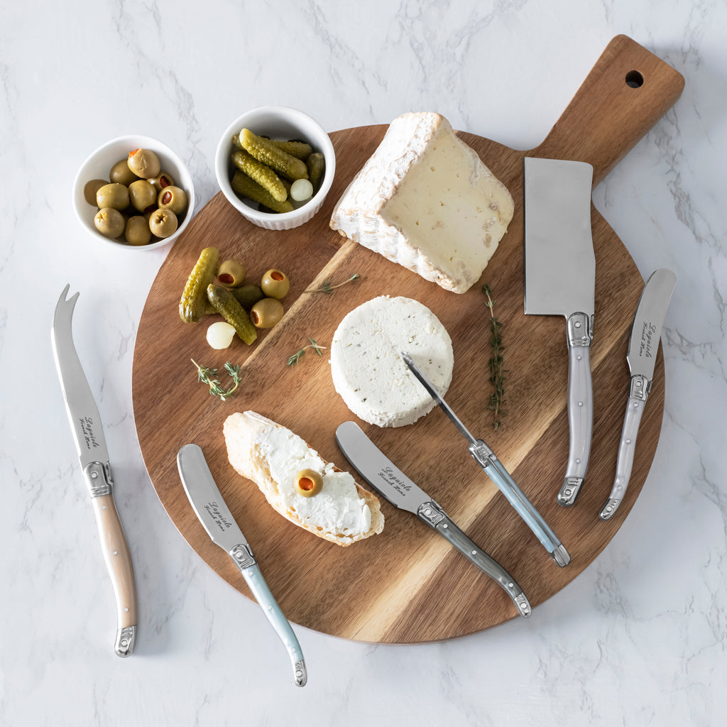 The handles of this 8-piece Laguiole cheese knife set in stunning pearlized shades of pewter green, sage, blue, and silvery white add fabulous pops of color that contrast beautifully with the round acacia wood board, making it ideal for casual elegant entertaining. Serve creamy mozzarella, sharp cheddar, and other favorite cheeses with these chic Laguiole cheese knives and spreaders displayed on the natural wood board. Laguiole cheese knives are renowned for having a three-rivet curved handle with the iconic bee emblem on its bolster symbolizing Napoleon and the French monarchy. Laguiole is a town in France where this style originated in the 1820s.