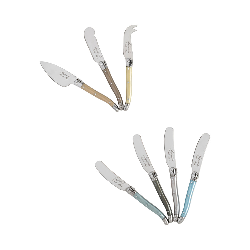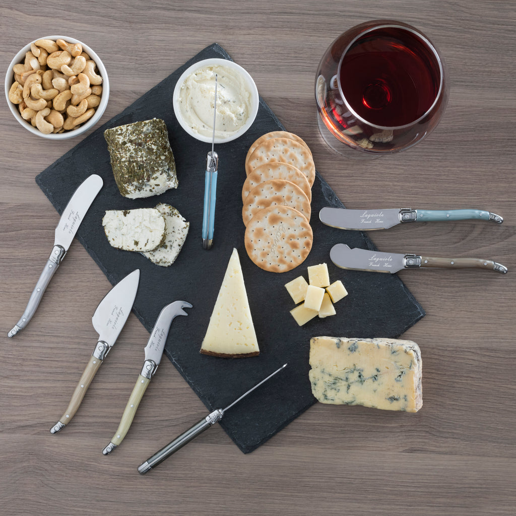 | It’s 5 o’clock somewhere and it’s time for cheese and crackers. Uncork the wine and breakout the creamy Brie, sharp cheddar, and delicious Boursin with French Home’s 7-piece Laguiole cheese knife set with stunning mother of pearl handles in pearlized shades of pewter green, sage, blue, and silvery white. Ideal for entertaining, this set of essential Laguiole cheese knives includes a 6.25’’spade, 5.75’’ fork tipped spear, 6’’ soft cheese spreader, and four 6.25’’ spreaders perfect for serving all varieties of cheese. The knives in this chic set are dishwasher safe making them as practical as they are elegant. The Laguiole design originated in France and is renowned for its three-rivet curved handle with a bee emblem on the bolster symbolizing Napoleon and the French monarchy. This set of seven cheese knives comes in a wood tray, perfect for storage and gift giving. |