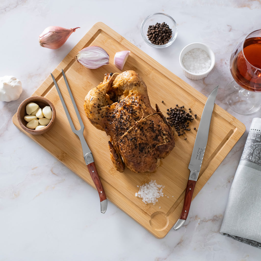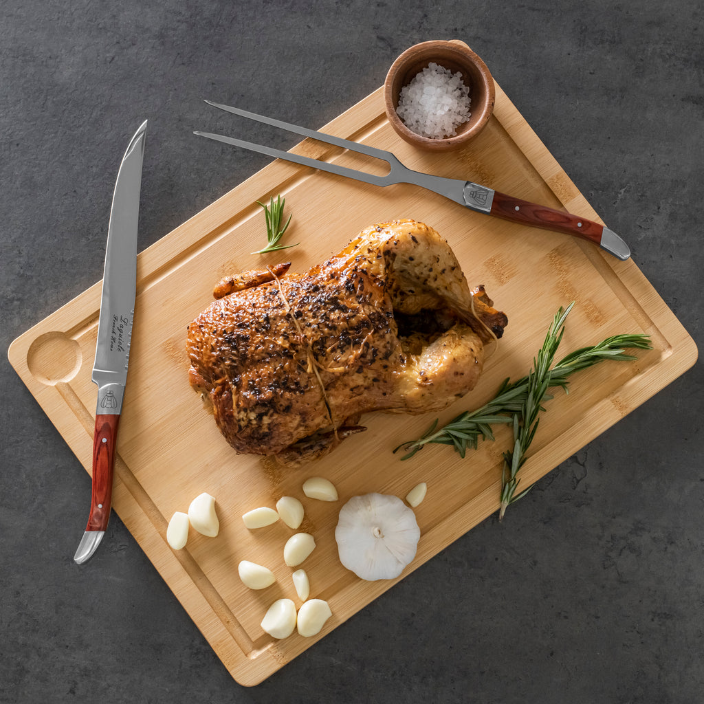 Carve turkey, ham, or beef conveniently, easily, and confidently at your next dinner party or festive gathering with French Home’s elegant Laguiole Pakkawood carving knife and fork set with natural bamboo cutting board. The stainless-steel blades of this fully tanged carving set provide superior durability and easily slice whatever you are carving, while the distinctive Pakkawood handles are naturally beautiful. The accompanying cutting board made from eco-friendly bamboo prevents mess, with a moat to catch and hold all the juices while meat is resting or being carved. The Laguiole designed ergonomic handles of this carving knife and fork are amazingly comfortable to hold and use. Laguiole is a traditional style of knife that originated in France and is renowned for having a three-rivet curved handle with a bee emblem on its bolster. The bee is a symbol of Napoleon and the French monarchy. Laguiole is a town in France where this style originated in the 1820s.