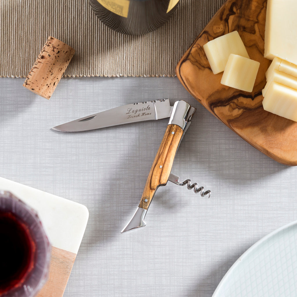 | French Home’s Olive Wood cutting board and Laguiole pocket-knife with corkscrew is the optimal bar set. A complete set ideal for slicing a delicious piece of cheese, opening a wonderful bottle of wine and cutting wedges of lemons or limes for the perfect cocktail. The 2.5mm thick blade is made from stainless steel and is 3.5" in length with forged stainless-steel bolsters. The bee emblem on the knife signifies the iconic Laguiole design, which originated in France in the 1820's. The spectacular cutting board is made from Olive Wood grown in the Mediterranean region, featuring a unique grain and is also beautiful and durable. When olive trees can no longer produce olives, the trees are repurposed by craftsmen into functional products. To maintain the beauty of the wood, washing by hand is recommended and periodically rub with food safe oil to preserve the woods natural grain. |