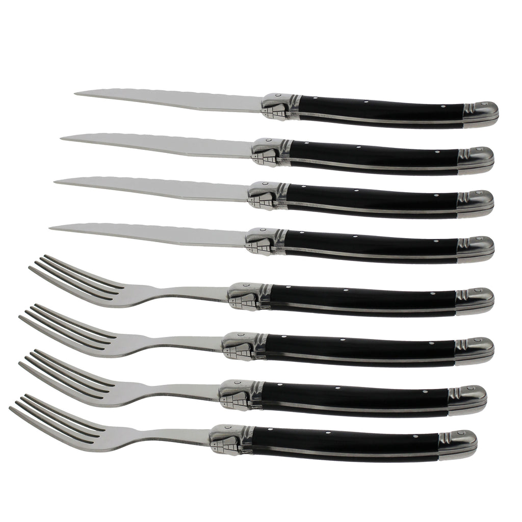 | For the chef and steak lover, the ultimate traditional French design set of knives and forks! Whether carving a roast or slicing vegetables the 5 piece French Home kitchen knife set is perfect for all your food preparation needs. The matching 8 steak knives and forks are ideal for a special steak dinner, the same design utensils as those used in French steak houses. The five piece kitchen set includes a chef's knife, carving knife, bread knife, utility knife and paring knife. The ergonomically designed curved handles with the three rivets and iconic bee emblem are comfortable to hold, adding an elegance to your kitchen and table. The blades cut effortlessly. An attractive magnetic wood display for the knives makes them visible and easily accessible. Laguiole is a town in France where this style originated. Chateaubriand or Steak Frites anyone? |