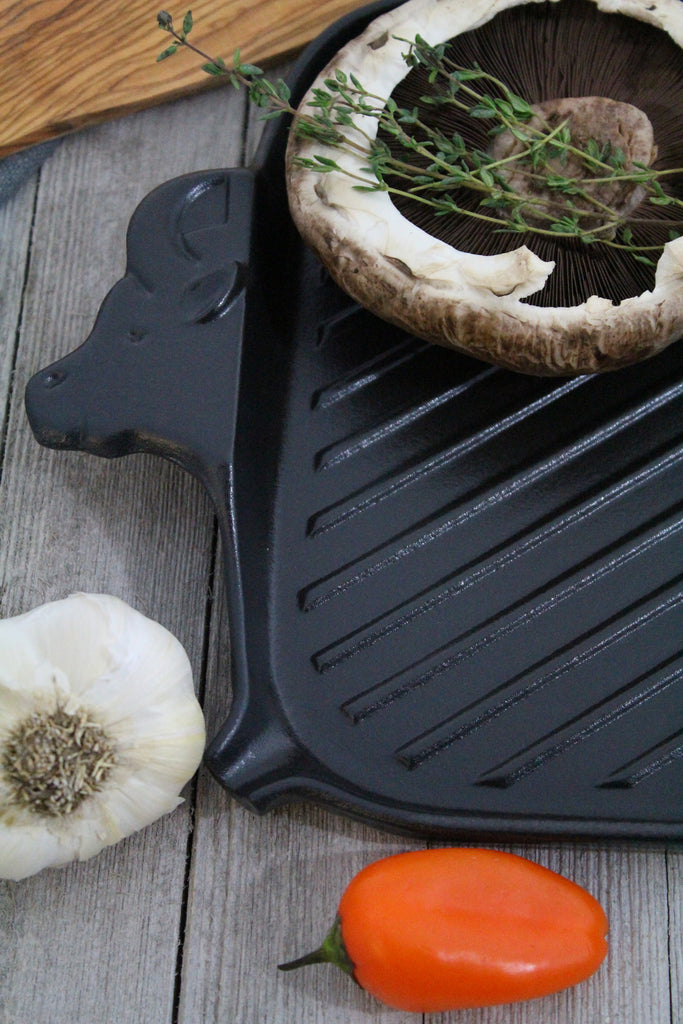 | The Chasseur cow shaped cast iron grill provides all the flavor of an outdoor grill, with all the convenience of indoor cooking. This grill pan is constructed of thick cast iron to maintain its temperature during cooking, making it ideal for grilling. While cooking, ridges allow excess fat and grease to drain, and the spout on the edge allows for easy removal. This grill can be used on almost all heating surfaces, and is a great way to serve a sizzling steak. |