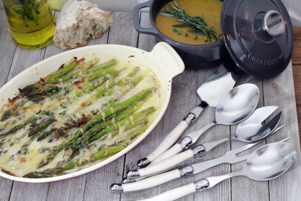 Perfect for delicious, potato's au gratin, roasted chicken, vegetables, pork, fish or a special beef roast, this incredibly useful Chasseur 11" x 8" oval shaped cast iron baking dish has been individually sand cast then enameled twice, adding vibrant color and protection against corrosion. Chasseur is versatile on all cooking surfaces, flame, oven, induction and electric while boasting even heating properties and exceptional browning capabilities. Together with the ease with which it can be cleaned makes Chasseur enameled cast iron cookware the best choice for delectable cooking. 14"L including handle x 8"W x 2.5"H